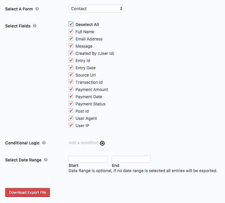 Once you’ve selected the form to be exported, you’ll get a list of options. These are the fields to export. You can select whichever fields you need, or just “Select All”. Next you’ll see Conditional Logic. This is an advanced feature beyond the scope of this article. Last you’ll see “Date Range” which allows you to set a range of dates to pull entries from.